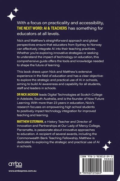 With a focus on practicality and accessibility, The Next Word: AI & Teachers has something for educators at all levels. Nick and Matthew's straightforward approach and global perspectives ensure that educators from Sydney to Norway can effectively integrate AI into their teaching practices. Whether you're exploring innovative strategies or seeking to understand the impact of technology on education, this comprehensive guide offers the tools and knowledge needed to shape the future of learning. This book draws upon Nick and Matthew's extensive experience in the field of education and has a clear objective: to explore the strategic and practical use of AI in schools, aiming to build AI awareness and capability for all students, staff and leaders in schools.