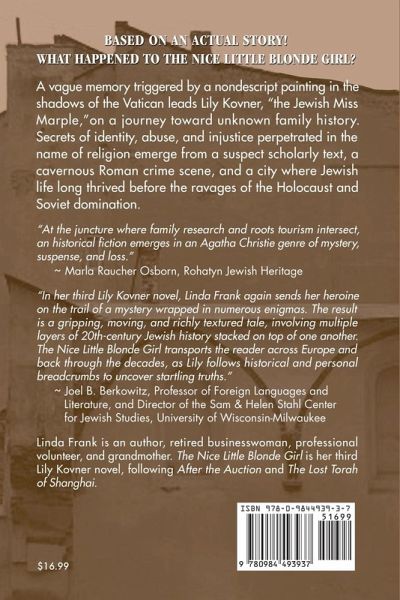 Lily Kovner, nicknamed the Jewish Miss Marple, accidentally spies a familiar-looking painting hanging in the unlikely setting of a shabby restaurant in Vatican City. Simon Rieger, her significant other, has been summoned to examine a previously unknown manuscript, attributed to a famous Talmudic scholar, unaccountably stored there. A suspicious death and the disappearance of both the painting and manuscript lead Lily and Simon to Lviv, Ukraine, newly freed from Soviet rule but a city lacking vestiges of the vibrant Jewish community that thrived there for centuries before World War II and isolation behind the Iron Curtain. Lily recalls her one pre-war childhood visit to this city then known as Lwów, Poland, and wonders if any of the relatives she met survived the Holocaust. The trail of the manuscript and painting provides early clues. Ultimately, the path reveals a modern woman's saga of solitary resiliance, despite the treachery of perpetrators professing to be holy, that mirrors a centuries-old local legend of a Jewish heroine who saved a landmark synagogue.