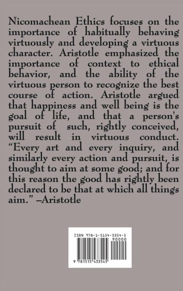 Nicomachean Ethics focuses on the importance of habitually behaving virtuously and developing a virtuous character. Aristotle emphasized the importance of context to ethical behavior, and the ability of the virtuous person to recognize the best course of action. Aristotle argued that happiness and well being is the goal of life, and that a person's pursuit of such, rightly conceived, will result in virtuous conduct.