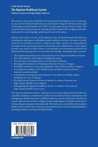 A Qualitative Investigation of the Barriers to the Delivery of High-Quality Healthcare Services in NigeriaThe Political and Economic Reforms Needed to Achieve Universal and High-Quality Health Care in NigeriaReimagining the Nigerian Healthcare System to Achieve Universal and High-Quality Health Care by 2030The Nigerian Healthcare System: Pathway to Universal and High-Quality Health Care is ideal for adoption as a textbook in health services administration, health policy andmanagement, health informatics, healthcare delivery systems, and primary health care courses offered at universities in Nigeria. It also would appeal to students and faculty in African diaspora programs internationally. The book is also essential for policymakers, health systems technocrats, researchers, and professionals in various health disciplines, including medicine, nursing, and allied health.