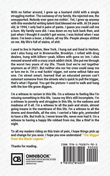 Growing up without a father and with a struggling single mother, I felt like the castaway of my family, unsupported and rejected. I had nothing handed to me; at 24, I owned just six pairs of pants and felt like a bum. My life seemed to spiral downward endlessly, with constant setbacks and people treating me poorly. Living in Harlem and Brownsville, I was surrounded by drugs, violence, and toxic relationships, but I refused to be lured into that destructive world.Racism, poverty, and hardship were constant companions, leaving me feeling incomplete and robbed of happiness. I wore a fake grin to hide the pain, pretending to have a life when I had never truly experienced one. My journey was marked by downs and downfalls, by sins and struggles that threatened to drive me insane.But through it all, I clung to my gift for writing, a talent that felt heaven-sent in the midst of my hellish existence. My words became a witness to the realities of life in the Black community, to the pain and strain that many endure silently. And now, as I share my story, I hope to offer solace to others on a similar journey.To all those riding the train of pain, I offer hope that things will pick up and change. I hope my words resonate with you, shedding light on the darkness of "The Nigger from the Black Lagoon."