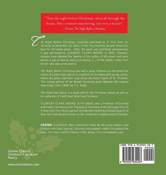 "'Twas the night before Christmas, when all through the house / Not a creature was stirring, not even a mouse" -From The Night Before Christmas The Night Before Christmas, originally published as A Visit from St. Nicholas on December 23, 1823, in the Troy Sentinel, became America's favorite Christmas poem. After the poem was published anonymously, it was attributed to CLEMENT CLARK MOORE in 1837. However, scholars have debated the identity of the author of this poem and some believe it was written by Henry Livingston, Jr., (1748-1828), a New York farmer who also wrote poetry. The Night Before Christmas has had a great influence on the American notion of Santa Claus and on its tradition of Christmas gift-giving, which, before the poem, had been inspired by the Dutch figure of St. Nicholas. This unique edition of the famed Christmas poem, features the original engravings, from 1849, by T.C. Boyd. This American classic is a great gift for the Christmas season as well as for collectors of traditional American literature.