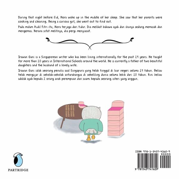 During that night before Eid, Nora woke up in the middle of her sleep. She saw that her parents were cooking and cleaning. Being a curious girl, she went out to find out. Pada malam Aidil Fitri itu, Nora terjaga dari tidur. Dia melihat bahawa ayah dan ibunya sedang memasak dan mengemas. Kerana sifat melitnya, dia pergi menyiasat.
