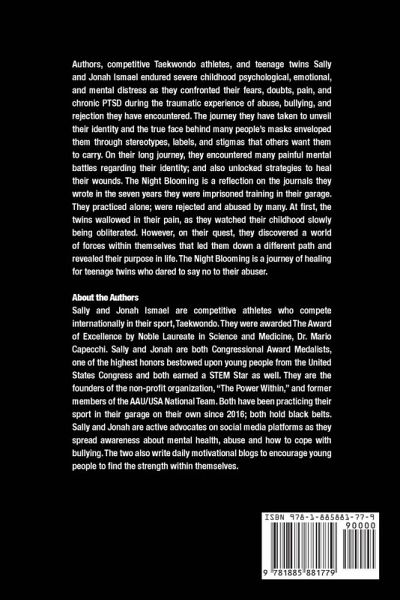 Authors, competitive Taekwondo athletes, and teenage twins Sally and Jonah Ismael endured severe childhood psychological, emotional, and mental distress as they confronted their fears, doubts, pain, and chronic PTSD during the traumatic experience of abuse, bullying, and rejection they have encountered. The journey they have taken to unveil their identity and the true face behind many people's masks enveloped them through stereotypes, labels, and stigmas that others want them to carry. On their long journey, they encountered many painful mental battles regarding their identity; and also unlocked strategies to heal their wounds. The Night Blooming is a reflection on the journals they wrote in the seven years they were imprisoned training in their garage. They practiced alone; were rejected and abused by many. At first, the twins wallowed in their pain, as they watched their childhood slowly being obliterated. However, on their quest, they discovered a world of forces within themselves that led them down a different path and revealed their purpose in life. The Night Blooming is a journey of healing for teenage twins who dared to say no to their abuser. About the Authors Sally and Jonah Ismael are competitive athletes who compete internationally in their sport, Taekwondo. They were awarded The Award of Excellence by Noble Laureate in Science and Medicine, Dr. Mario Capecchi. Sally and Jonah are both Congressional Award Medalists, one of the highest honors bestowed upon young people from the United States Congress and both earned a STEM Star as well. They are the founders of the non-profit organization, "The Power Within," and former members of the AAU/USA National Team. Both have been practicing their sport in their garage on their own since 2016; both hold black belts. Sally and Jonah are active advocates on social media platforms as they spread awareness about mental health, abuse and how to cope with bullying. The two also write daily motivational blogs to encourage young people to find the strength within themselves.