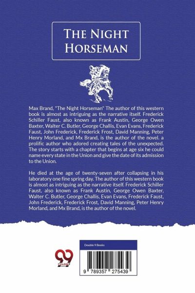 Max Brand, "The Night Horseman" The author of this western book is almost as intriguing as the narrative itself. Frederick Schiller Faust, also known as Frank Austin, George Owen Baxter, Walter C. Butler, George Challis, Evan Evans, Frederick Faust, John Frederick, Frederick Frost, David Manning, Peter Henry Morland, and Mx Brand, is the author of the novel. a prolific author who adored creating tales of the unexpected. The story starts with a chapter that begins at age six he could name every state in the Union and give the date of its admission to the Union. He died at the age of twenty-seven after collapsing in his laboratory one fine spring day. The author of this western book is almost as intriguing as the narrative itself. Frederick Schiller Faust, also known as Frank Austin, George Owen Baxter, Walter C. Butler, George Challis, Evan Evans, Frederick Faust, John Frederick, Frederick Frost, David Manning, Peter Henry Morland, and Mx Brand, is the author of the novel.