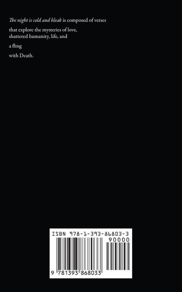 The night is cold and bleak is composed of verses that explore the mysteries of love, shattered humanity, life, and a fling with Death. I hunger I hunger for things that have a soul If you have one, I will eat you... I know a woman who, in order to breathe, writes a line or two of poetry I also know a man who dances, naked in moonlight with the ghost of his beloved I ate them. I hunger for things that have a soul and I am starving Because when I show the world a beautiful red rose they only see the thorns. I killed myself I killed myself a thousand times in fiction so that I could face this life without losing my Soul. With her arms crossed With her arms crossed behind her back trapped in a pillowcase, >"Write a poem on me" she said and I obeyed, very carefully First, with my lips, then with my tongue, I wrote slowly on her canvas while she held me with her eyes - eyes that spread out like branches >More luminous than the evening, I tore the night to pieces and dipped into her soul "Be gentle" she whispered with a sigh, like a soft flower to the moon while I continued to contemplate the fire, >With my lips replete with her kisses and her breaths breaking on my skin to the sound of grace, she bit my shoulder, and pulled me up from the depths of the earth >I pressed her cheek against the pillow and watched her melting, with every thrust The sheets, wet and swollen, >She whimpered, crying tears of the moon - >We died that night >when I sank deep into her arms and drowned, she held my hand to the other side of life.