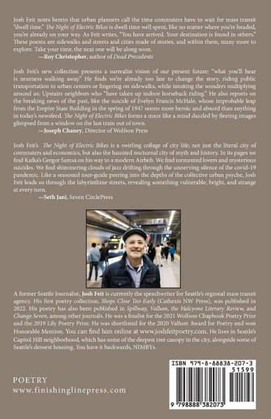 Josh Feit mines decades as a city hall reporter to find metaphors and meaning in bike lanes, zoning code, housing density, and city infrastructure with a set of poems that cherishes urban planning and metro living. It's as if Jane Jacobs and Frank O'Hara made a Surrealist film together. "The wind is made of apartment buildings," he writes in the poem "City Planning Pantoum." And while City planning certainly provides the prompt here (one prize-winning poem details a recent Seattle Dept. of Transportation sidewalk report), this collection translates the NACTO (National Association of City Transportation Officials) lingo of "dwell times" and "linger factors" into verse that contemplates existential moods and aspirations.