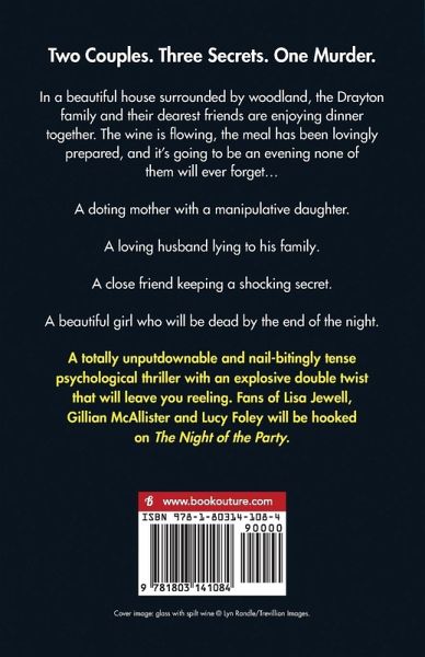 Two Couples. Three Secrets. One Murder. In a beautiful house surrounded by woodland, the Drayton family and their dearest friends are enjoying dinner together. The wine is flowing, the meal has been lovingly prepared, and it's going to be an evening none of them will ever forget... A doting mother with a manipulative daughter. A loving husband lying to his family. A close friend keeping a shocking secret. A beautiful girl who will be dead by the end of the night. A totally unputdownable and nail-bitingly tense psychological thriller with an explosive double twist that will leave you reeling. Fans of Lisa Jewell, Gillian McAllister and Lucy Foley will be hooked on The Night of the Party.