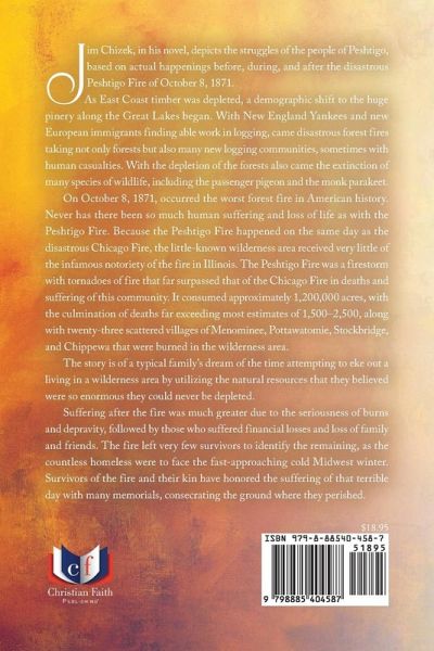 Jim Chizek, in his novel, depicts the struggles of the people of Peshtigo, based on actual happenings before, during, and after the disastrous Peshtigo Fire of October 8, 1871. As East Coast timber was depleted, a demographic shift to the huge pinery along the Great Lakes began. With New England Yankees and new European immigrants finding able work in logging, came disastrous forest fires taking not only forests but also many new logging communities, sometimes with human casualties. With the depletion of the forests also came the extinction of many species of wildlife, including the passenger pigeon and the monk parakeet. On October 8, 1871, occurred the worst forest fire in American history. Never has there been so much human suffering and loss of life as with the Peshtigo Fire. Because the Peshtigo Fire happened on the same day as the disastrous Chicago Fire, the little-known wilderness area received very little of the infamous notoriety of the fire in Illinois. The Peshtigo Fire was a firestorm with tornadoes of fire that far surpassed that of the Chicago Fire in deaths and suffering of this community. It consumed approximately 1,200,000 acres, with the culmination of deaths far exceeding most estimates of 1,500-2,500, along with twenty-three scattered villages of Menominee, Pottawatomie, Stockbridge, and Chippewa that were burned in the wilderness area. The story is of a typical family's dream of the time attempting to eke out a living in a wilderness area by utilizing the natural resources that they believed were so enormous they could never be depleted. Suffering after the fire was much greater due to the seriousness of burns and depravity, followed by those who suffered financial losses and loss of family and friends. The fire left very few survivors to identify the remaining, as the countless homeless were to face the fast-approaching cold Midwest winter. Survivors of the fire and their kin have honored the suffering of that terrible day with many memorials, consecrating the ground where they perished. 2
