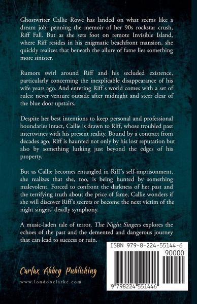 Ghostwriter Callie Rowe has landed on what seems like a dream job: penning the memoir of her 90s rockstar crush, Riff Fall. But as she sets foot on remote Invisible Island, where Riff resides in his enigmatic beachfront mansion, she quickly realizes that beneath the allure of fame lies something more sinister. Rumors swirl around Riff and his secluded existence, particularly concerning the disappearance of his wife years ago. And entering Riff's world comes with a set of rules: never venture outside after midnight and steer clear of the blue door upstairs. Despite her best intentions to keep personal and professional boundaries intact, Callie is drawn to Riff, whose troubled past intertwines with his present reality. Bound by a contract from decades ago, Riff is haunted not only by his lost reputation but also by something lurking just beyond the edges of his property. But as Callie becomes entangled in Riff's self-imprisonment, she realizes that she, too, is being hunted by something malevolent. Forced to confront the darkness of her past and the terrifying truth about the price of fame, Callie wonders if she will discover Riff's secrets or become the next victim of the night singers' deadly symphony. A music-laden tale of terror, The Night Singers explores the echoes of the past and the demented and dangerous journey that can lead to success or ruin.