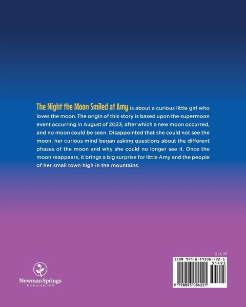 The Night the Moon Smiled at Amy is about a curious little girl who loves the moon. The origin of this story is based upon the supermoon event occurring in August of 2023, after which a new moon occurred, and no moon could be seen. Disappointed that she could not see the moon, her curious mind began asking questions about the different phases of the moon and why she could no longer see it. Once the moon reappears, it brings a big surprise for little Amy and the people of her small town high in the mountains.