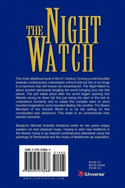 The most rebellious book of the 21 Century. Turning a cold shoulder towards comtemporary mainstream arthur's this fox fire of art sings to a harmony that will forever be remembered. The Night Watch is about ancient astronauts tangling the world bringing fury into this planet. The plot takes place after the world began opening into Atlantis during its down fall this just being the start of the trek to understand humanity and to cease the complex wars of one's haunted imagination one's haunted destiny into another. The Seven Wonders of the Ancient World is to be the setting for this complicated epic adventure. This leads to an unmentioned man named Leonardo.