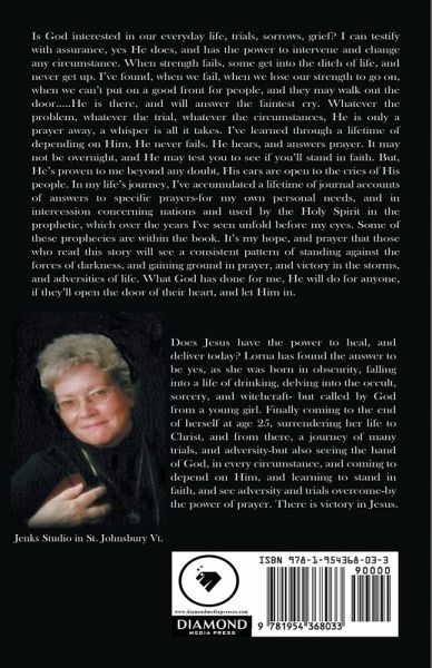 Is God interested in our everyday life, trials, sorrows, grief? I can testify with assurance, yes He does, and has the power to intervene and change any circumstance. When strength fails, some get into the ditch of life, and never get up. I've found, when we fail, when we lose our strength to go on, when we can't put on a good front for people, and they may walk out the door.....He is there, and will answer the faintest cry. Whatever the problem, whatever the trial, whatever the circumstances, He is only a prayer away, a whisper is all it takes. I've learned through a lifetime of depending on Him, He never fails. He hears, and answers prayer. It may not be overnight, and He may test you to see if you'll stand in faith. But, He's proven to me beyond any doubt, His ears are open to the cries of His people. In my life's journey, I've accumulated a lifetime of journal accounts of answers to specific prayers-for my own personal needs, and in intercession concerning nations and used by the Holy Spirit in the prophetic, which over the years I've seen unfold before my eyes. Some of these prophecies are within the book. It's my hope, and prayer that those who read this story will see a consistent pattern of standing against the forces of darkness, and gaining ground in prayer, and victory in the storms, and adversities of life. What God has done for me, He will do for anyone, if they'll open the door of their heart, and let Him in. Does Jesus have the power to heal, and deliver today? Lorna has found the answer to be yes, as she was born in obscurity, falling into a life of drinking, delving into the occult, sorcery, and witchcraft- but called by God from a young girl. Finally coming to the end of herself at age 25, surrendering her life to Christ, and from there, a journey of many trials, and adversity-but also seeing the hand of God, in every circumstance, and coming to depend on Him, and learning to stand in faith, and see adversity and trials overcome-by the power of prayer. There is victory in Jesus.