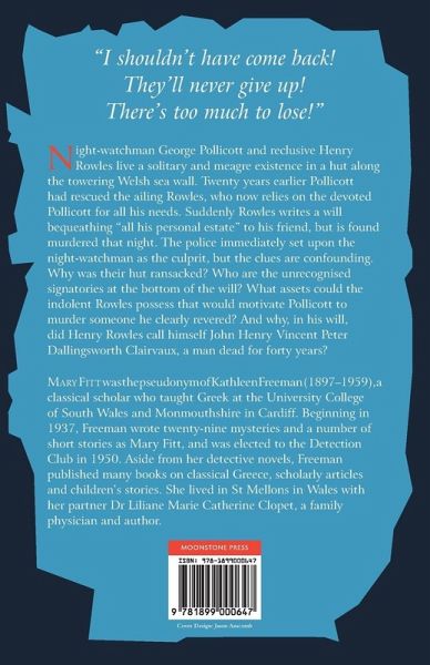 'I shouldn't have come back! They'll never give up! There's too much to lose!' George Pollicott and Henry Rowles live a solitary and meagre existence in a hut along the towering Sea Wall of the Welsh Lowlands. On a foggy night twenty years before, night-watchman Pollicott had found Rowles near death and nursed him back to health. Henry Rowles, an obviously educated man, shuns outside contact and relies on the devoted Pollicott for all his needs. Recently worried for his life, Rowles writes a will leaving everything to his friend, but is found murdered that very night. The police immediately set upon the night-watchman as the culprit, but the clues are confounding. Why was their hut ransacked? Who are the unrecognized signatories at the bottom of the will? What motivation would Pollicott have for murdering someone he clearly revered? And why did Henry Rowles refer to his real name as John Henry Vincent Peter Dallingsworth Clairvaux, a man dead for forty years? Mary Fitt was the pseudonym of Kathleen Freeman (1897-1959), a classical scholar who taught Greek at the University College of South Wales and Monmouthshire in Cardiff. Beginning in 1937, Freeman wrote twenty-nine mysteries and a number of short stories, mostly as Mary Fitt, and was elected to the Detection Club in 1950. Aside from her detective novels, Freeman published many books on classical Greece, scholarly articles and children's stories. She lived in St Mellons in Wales with her partner Dr Liliane Marie Catherine Clopet, a family physician and author.
