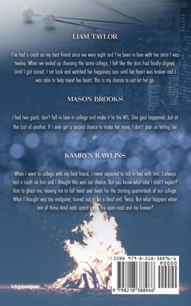 Liam Taylor I've had a crush on my best friend since we were eight and I've been in love with her since I was twelve. When we ended up choosing the same college, I felt like the stars had finally aligned. Until I got scared. I sat back and watched her happiness soar until her heart was broken and I was able to help mend her heart. This is my chance to not let her go. Mason Brooks I had two goals: don't fall in love in college and make it to the NFL. One goal happened...but at the cost of another. If I ever get a second chance to make her mine, I don't plan on letting her go. Kamryn Rawlins When I went to college with my best friend, I never expected to fall in bed with him. I always had a crush on him and I thought this was our chance. But you know what else I didn't expect? Him to ghost me, leaving me to fall head over heels for the starting quarterback of our college. What I thought was my endgame, turned out to be a dead end. Twice. But what happens when one of those dead ends opens up to the open road and my forever?