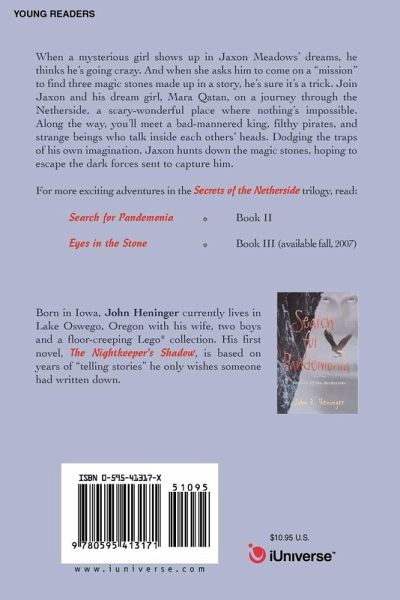 When a mysterious girl shows up in Jaxon Meadows' dreams, he thinks he's going crazy. And when she asks him to come on a "mission" to find three magic stones made up in a story, he's sure it's a trick. Join Jaxon and his dream girl, Mara Qatan, on a journey through the Netherside, a scary-wonderful place where nothing's impossible. Along the way, you'll meet a bad-mannered king, filthy pirates, and strange beings who talk inside each others' heads. Dodging the traps of his own imagination, Jaxon hunts down the magic stones, hoping to escape the dark forces sent to capture him. For more exciting adventures in the Secrets of the Netherside trilogy, read: Search for Pandemonia Book II Eyes in the Stone Book III (available fall, 2007)
