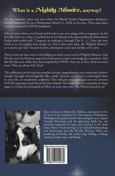 What is a Nightly Missive, anyway? Do you remember where you were when the World Health Organization declared a Global Pandemic? It was a Wednesday; March 11, 2020, to be exact. Three days later, a new era dawned: COVID lockdown. Like so many others, my friends and I took to our text strings with a vengeance. Over the next week or so, the nightly texts caught on. Over a few more days, the "Nightly Missive," as it (some say "she") became known, developed a style and rhythm of its own. That is how you have come to be holding an entire year's worth of Nightly Missives. Like life that year, the Missives range from humorous to sad to encouraging to mundane. Also like life that year, while they were inspired by COVID, they are, in fact, about so much more. They are about ALL of us! The Nightly Missive will give you a glimpse into one person's COVID experience and that of her best friends. You might just see yourselves in these pages or at least be prompted to reflect on your own year. The Missive marches on!