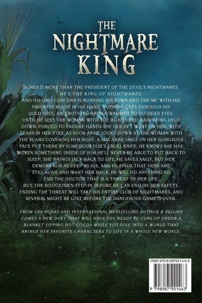 Bones is more than the President of the Devil's Nightmares. He's the King of Nightmares. And his only concern is running his town and the MC with his favorite blade in his hand. Nothing gets through his cold soul, and nothing brings warmth to his dead eyes. Until he sees the woman with the blood-red hair being held down, forced to endure hands she doesn't want on her, with tears in her eyes. As soon as he looks down at the woman with the scars covering her body, a macabre smile on her gorgeous face put there by somebody else's cruel knife, he knows she has woken something inside of him he'll never be able to put back to sleep. She brings Jack back to life. He saves Sally, but her demons run as deep as his, and he finds that hers are still alive and want her back. He will do anything to end the Doctor that is a threat to her life. But the Boogeymen step in before he can ensure her safety. Ending the threat will take his entire club of Nightmares, and several might be lost before the dangerous game is over. From USA Today and International Bestselling author R Sullins comes a new duet that will have you ready to curl up under a blanket sipping hot cocoa while you dive into a world that brings her favorite characters to life in a whole new world.