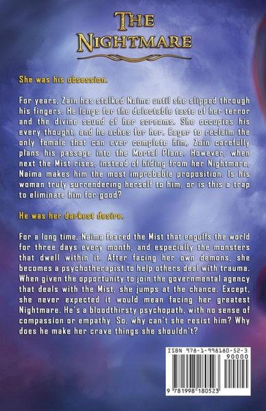 She was his obsession. For years, Zain has stalked Naima until she slipped through his fingers. He longs for the delectable taste of her terror and the divine sound of her screams. She occupies his every thought, and he aches for her. Eager to reclaim the only female that can ever complete him, Zain carefully plans his passage into the Mortal Plane. However, when next the Mist rises, instead of hiding from her Nightmare, Naima makes him the most improbable proposition. Is his woman truly surrendering herself to him, or is this a trap to eliminate him for good? He was her darkest desire. For a long time, Naima feared the Mist that engulfs the world for three days every month, and especially the monsters that dwell within it. After facing her own demons, she becomes a psychotherapist to help others deal with trauma. When given the opportunity to join the governmental agency that deals with the Mist, she jumps at the chance. Except, she never expected it would mean facing her greatest Nightmare. He's a bloodthirsty psychopath, with no sense of compassion or empathy. So, why can't she resist him? Why does he make her crave things she shouldn't?