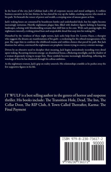 In the heart of the city, Jack Callahan leads a life of corporate success and moral ambiguity. A ruthless business executive in his late thirties, he has clawed his way up the ladder, crushing anyone who stands in his path. Yet beneath the veneer of power and wealth, a creeping sense of unease gnaws at him. Jack's waking hours are consumed by boardroom battles and underhanded deals, but his nights become increasingly torturous. Horrific nightmares plague him, filled with shadowy figures lurking in haunting landscapes, echoing with bloodcurdling screams that chill him to his core. With each passing night, the nightmares intensify, evoking primal fears and unspeakable dread that seep into his waking life. Disturbed by the vividness of these night terrors, Jack seeks help from Dr. Loretta Hayes, a therapist who suggests the dreams are manifestations of his guilt-a reckoning for the ethical transgressions of his past. She urges him to confront the childhood trauma and ruthless choices that paved his path. But Jack dismisses her advice, convinced the nightmares are prophetic visions trying to convey a sinister message. Driven by an obsessive need to decipher their meaning, Jack begins meticulously recording every detail upon waking. Recurring elements emerge: an abandoned house, a flickering streetlight, and the shadow of a woman desperately trying to escape him. These symbols become increasingly disturbing, reflecting the wreckage of lives he has shattered through his callous ambition. As the nightmares worsen, Jack's grip on reality unravels. His relationships crumble as he pushes away the few supportive figures in his life. Paranoia consumes him, and he becomes entangled in a web of his own delusions, convinced an unseen force is hunting him. The pressure mounts until, in a fit of desperation, he isolates himself, spending nights piecing together a codex of terror from his dream journal. Then, one fateful night, the culmination of Jack's nightmares leads him to confront the spectral woman face-to-face. She reveals herself as a manifestation of his conscience-a figure representing all those he has hurt. In this climactic confrontation, she lays bare the truth: each nightmare depicts a life he shattered, a family torn apart by his ruthless ambition and greed. Her final words echo hauntingly: "You are already free from flesh but chained by your actions." As the unnatural terror gives way to a burgeoning understanding, Jack awakens one last time. But this time, he feels an overwhelming weight and a chilling clarity. As he pulls himself from bed, Jack is struck by the horrifying reality-he is still trapped in the barren landscape of his nightmares. He now understands it is a depiction of his eternal punishment. The twisted shadows morph into the faces of those he wronged, their sorrow and rage palpable as they surround him. Jack wanders this purgatorial realm, realizing the nightmares were never mere dreams, but visions of his own conscience replaying the consequences of his actions. Each horrifying scene was a reminder of the pain he inflicted, endlessly echoing as a cycle of suffering. In the end, Jack relinquishes his regrets and embraces the damnation he must face for the life he led. He becomes part of the landscape of lost souls, learning that true horror lies not in the nightmares themselves, but in the lingering echoes of one's choices-forever confined to confront them in a world beyond the living.