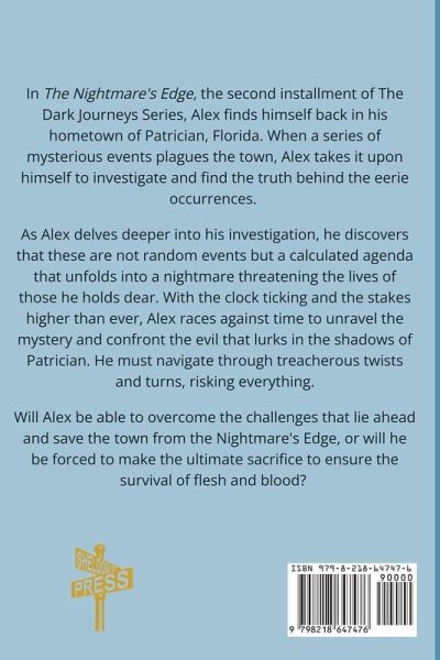 In "The Nightmares Edge: An Alex Archer Adventure," the second installment of the series, our protagonist Alex Archer finds himself back in his hometown of Patrician, Florida. When a series of mysterious events plague the town, Alex takes it upon himself to investigate and uncover the truth behind the eerie occurrences. As Alex delves deeper into the investigation, he discovers that these are not random events but a calculated agenda that unfolds into a nightmare threatening the lives of those he holds dear. With the clock ticking and the stakes higher than ever, Alex races against time to unravel the mystery and confront the evil that lurks in the shadows of Patrician. He must navigate through treacherous twists and turns, risking everything. Will Alex be able to overcome the challenges that lie ahead and save the town from the Nightmares Edge, or will he be forced to make the ultimate sacrifice to ensure the survival of flesh and blood? Join Alex Archer on this thrilling adventure filled with suspense, danger, and heart-pounding twists.