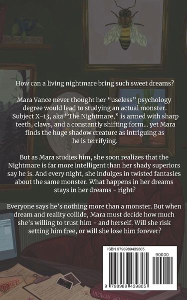 How can a living nightmare bring such sweet dreams? Mara Vance never thought her "useless" psychology degree would lead to studying an actual monster. Subject X-13, aka "The Nightmare," is armed with sharp teeth, claws, and a constantly shifting form... yet Mara finds the huge shadow creature as intriguing as he is terrifying. But as Mara studies him, she soon realizes that the Nightmare is far more intelligent than her shady superiors say he is. And every night, she indulges in twisted fantasies about the same monster. What happens in her dreams stays in her dreams - right? Everyone says he's nothing more than a monster. But when dream and reality collide, Mara must decide how much she's willing to trust him - and herself. Will she risk setting him free, or will she lose him forever?