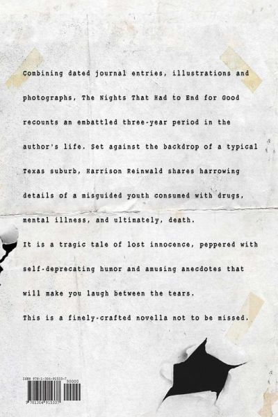 Combining dated journal entries, illustrations and photographs, The Nights That Had to End for Good recounts an embattled three-year period in the author's life. Set against the backdrop of a typical Texas suburb, Harrison Reinwald shares harrowing details of a misguided youth consumed with drugs, mental illness, and ultimately, death. It is a tragic tale of lost innocence, peppered with self-deprecating humor and amusing anecdotes that will make you laugh between the tears. This is a finely-crafted novella not to be missed.