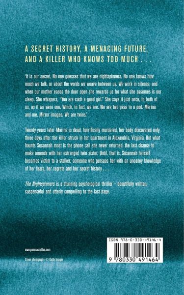 'It is our secret. No one guesses that we are nightspinners. No one knows how much we talk, or about the words we weave between us. We work in silence, and when our mother eases the door open she rewards us for what she assumes is our sleep. She whispers "You are such a good girl." She says it just once, to both of us, as if we were one. Which, in fact, we are. We are two peas in a pod. Marina and me. Mirror images. We are twins.'