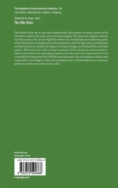 This volume offers up-to-date and comprehensive information on various aspects of the Nile River, which is the main source of water in Egypt. The respective chapters examine the Nile journey; the Aswan High Dam Reservoir; morphology and sediment quality of the Nile; threats to biodiversity; fish and fisheries; rain-fed agriculture, rainfall data, and fluctuations in rainfall; the impact of climate change; and hydropolitics and legal aspects. The book closes with a concise summary of the conclusions and recommendations provided in the preceding chapters, and discusses the requirements for the sustainable development of the Nile River and potential ways to transform conflicts into cooperation. Accordingly, it offers an invaluable source of information for researchers, graduate students and policymakers alike.
