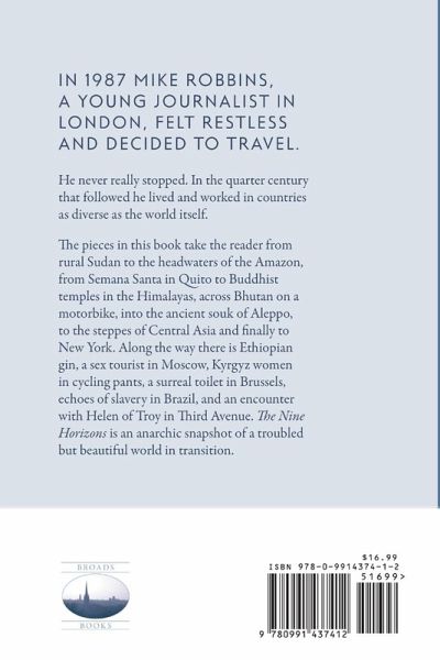 In 1987 Mike Robbins, a young journalist in London, felt restless and decided to travel. He never really stopped. In the quarter century that followed he lived and worked in countries as diverse as the world itself. The pieces in this book take the reader from rural Sudan to the headwaters of the Amazon, from Semana Santa in Quito to Buddhist temples in the Himalayas, across Bhutan on a motorbike, into the ancient souk of Aleppo, to the steppes of Central Asia and finally to New York. Along the way there is Ethiopian gin, a sex tourist in Moscow, Kyrgyz women in cycling pants, a surreal toilet in Brussels, echoes of slavery in Brazil, and an encounter with Helen of Troy in Third Avenue. The Nine Horizons is an anarchic snapshot of a troubled but beautiful world in transition.