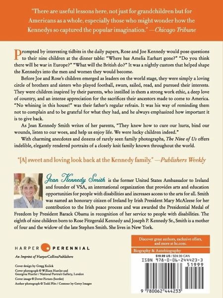 In this evocative and affectionate memoir, Ambassador Jean Kennedy Smith, the last surviving child of Joe and Rose Kennedy, offers an intimate and illuminating look at a time long ago when she and her siblings, guided by their parents, laughed and learned a great deal under one roof. Prompted by interesting tidbits in the newspaper, Rose and Joe Kennedy would pose questions to their nine children at the dinner table. "Where could Amelia Earhart have gone?" "How would you address this horrible drought?" "What would you do about the troop movements in Europe?" It was a nightly custom that helped shape the Kennedys into who they would become. Before Joe and Rose’s children emerged as leaders on the world stage, they were a loving circle of brothers and sisters who played football, swam, read, and pursued their interests. They were children inspired by parents who instilled in them a strong work ethic, deep love of country, and intense appreciation for the sacrifices their ancestors made to come to America. "No whining in this house!" was their father’s regular refrain. It was his way of reminding them not to complain, to be grateful for what they had, and to give back. In her remarkable memoir, Kennedy Smith—the last surviving sibling—revisits this singular time in their lives. Filled with fascinating anecdotes and vignettes, and illustrated with dozens of family pictures, The Nine of Us vividly depicts this large, close-knit family during a different time in American history. Kennedy Smith offers indelible, elegantly rendered portraits of her larger-than-life siblings and her parents. "They knew how to cure our hurts, bind our wounds, listen to our woes, and help us enjoy life," she writes. "We were lucky children indeed."