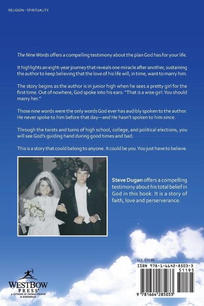 The Nine Words offers a compelling testimony about the plan God has for your life. It highlights an eight-year journey that reveals one miracle after another, sustaining the author to keep believing that the love of his life will, in time, want to marry him. The story begins as the author is in junior high when he sees a pretty girl for the first time. Out of nowhere, God spoke into his ears: "That is a wise girl. You should marry her." Those nine words were the only words God ever has audibly spoken to the author. He never spoke to him before that day-and He hasn't spoken to him since. Through the twists and turns of high school, college, and political elections, you will see God's guiding hand during good times and bad. This is a story that could belong to anyone. It could be you. You just have to believe.