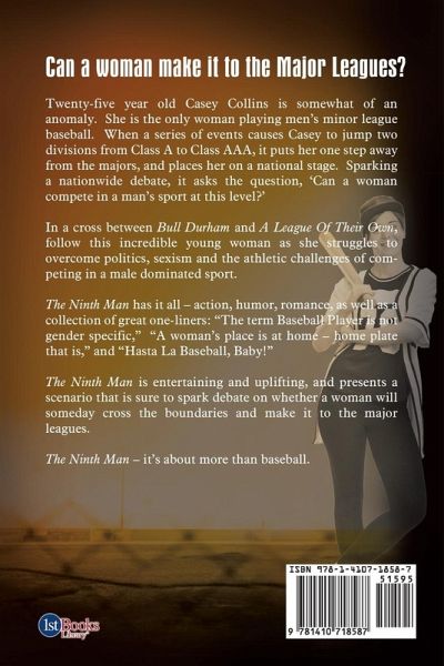 Can a woman make it to the Major Leagues? Twenty-five year old Casey Collins is somewhat of an anomaly. She is the only woman playing men's minor league baseball. When a series of events causes Casey to jump two divisions from Class A to Class AAA, it puts her one step away from the majors, and places her on a national stage. Sparking a nationwide debate, it asks the question, 'Can a woman compete in a man's sport at this level?' In a cross between Bull Durham and A League Of Their Own, follow this incredible young woman as she struggles to overcome politics, sexism and the athletic challenges of competing in a male dominated sport. The Ninth Man has it all - action, humor, romance, as well as a collection of great one liner's: "The term Baseball Player is not gender specific," "A woman's place is at home - home plate that is," and "Hasta La Baseball, Baby!" The Ninth Man is entertaining and uplifting, and presents a scenario that is sure to spark debate on whether a woman will someday cross the boundaries and make it to the major leagues. The Ninth Man - it's about more than baseball.