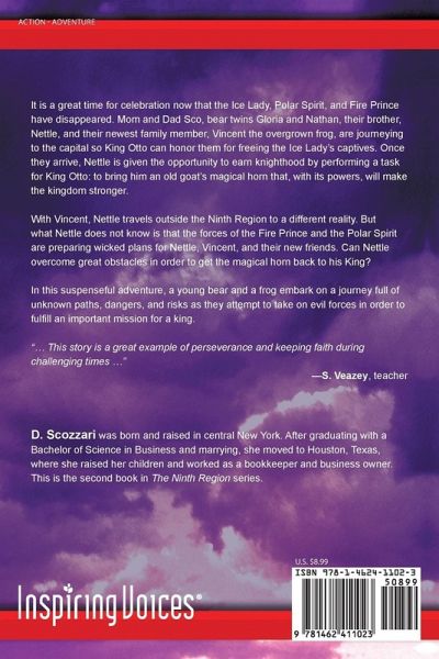 It is a great time for celebration now that the Ice Lady, Polar Spirit, and Fire Prince have disappeared. Mom and Dad Sco, bear twins Gloria and Nathan, their brother, Nettle, and their newest family member, Vincent the overgrown frog, are journeying to the capital so King Otto can honor them for freeing the Ice Lady’s captives. Once they arrive, Nettle is given the opportunity to earn knighthood by performing a task for King Otto: to bring him an old goat’s magical horn that, with its powers, will make the kingdom stronger. With Vincent, Nettle travels outside the Ninth Region to a different reality. But what Nettle does not know is that the forces of the Fire Prince and the Polar Spirit are preparing wicked plans for Nettle, Vincent, and their new friends. Can Nettle overcome great obstacles in order to get the magical horn back to his King? In this suspenseful adventure, a young bear and a frog embark on a journey full of unknown paths, dangers, and risks as they attempt to take on evil forces in order to fulfill an important mission for a king. "… This story is a great example of perseverance and keeping faith during challenging times …" —S. Veazey, teacher