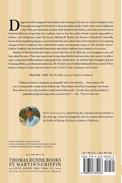 Beware of sodium? No need to forego baked goodies with this unusual baking book by the author of the No-Salt, Lowest Sodium Diet Cookbook. Donald Gazzaniga, diagnosed with congestive heart failure, was headed for a heart transplant. Urged by his doctor to keep his sodium intake "under 1,500 to 2,000 milligrams a day," Don headed for the kitchen and went to work devising recipes for delicious low-sodium dishes that added up to less than 500 milligrams daily. The results? Don's name has been removed from the transplant list, and Don shared his recipes with the world in The No-Salt, Lowest-Sodium Cookbook. Readers of that first book have kept in touch with Don via his Web site, and have written him letters asking for more. What they most often ask for is a book with more bread recipes, more recipes for cakes and cookies and muffins and tea breads, more of all those great baked things-in short, for the book you now hold in your hands. Don teamed up with his daughter, professional nutritionist Dr. Jeannie Gazzaniga Moloo, to fill The No-Salt, Lowest-Sodium Baking Book with recipes that are as healthy and delicious as possible. As in the previous book, they tell you just how much sodium is in each ingredient. They provide satisfactory substitutes for flavorings that patients with congestive heart failure and high blood pressure shouldn't have. All easy to make and delicious to eat. Go for it!