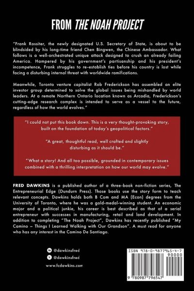 The Noah Project: It is November of 2032. Frank Rossiter, the newly designated U. S. Secretary of State, is about to be blindsided by his long-time friend Chen Bingwen .the Chinese Ambassador. What follows is a well orchestrated, unique attack designed to crush an already failing America. Hampered by his government's partisanship and his president's incompetence, Frank struggles to re-establish critical ties before his country is lost, while facing a disturbing internal threat with worldwide implications. Meanwhile, Toronto venture capitalist, Rob Frederickson, has assembled an elite group of investors determined to solve the global issues being mishandled by world leaders. At a remote location, known as Arcadia, Frederickson's cutting edge research is intended to serve as a vessel to the future, regardless of how the world evolves.