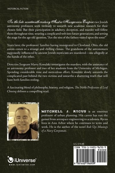 In the late nineteenth century Austro-Hungarian Empire, two Jewish astronomy professors work tirelessly to unearth new academic research for their chosen field. But their participation in adultery, deception, and murder will follow them throughout time, weaving a complicated web into future generations, and setting the stage for the age-old question, "Are the sins of the fathers visited upon the sons?" Years later, the professors' families having immigrated to Cleveland, Ohio, the old axiom comes to a strange and chilling climax. The grandsons of the astronomers supposedly influenced by ancient Jewish mysticism are murdered-one allegedly at the hands of the other. Detective Sergeant Marty Kowalski investigates the murders, with the assistance of an astronomy professor and two of her students from the University of Michigan. Spending considerable time and meticulous effort, Kowalski slowly unravels the complicated past behind the two victims and unearths a shattering truth that will leave both families reeling. A fascinating blend of philosophy, history, and religion, The Noble Profession of Leaf Chasing delivers a compelling read.