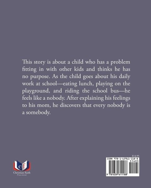 This story is about a child who has a problem fitting in with other kids and thinks he has no purpose. As the child goes about his daily work at school--eating lunch, playing on the playground, and riding the school bus--he feels like a nobody. After explaining his feelings to his mom, he discovers that every nobody is a somebody. 2