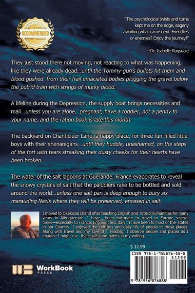 They just stood there not moving, not reacting to what was happening, like they were already dead... until the Tommy-gun's bullets hit them and blood gushed from their frail emaciated bodies plugging the gravel below the putrid train with strings of murky blood. A preening sadistic drug kingpin destroys anyone in his path for power, lust, and wealth... until someone opens the enclosure, and the monstrous gator scrambles out to become the alpha of the pool. A lifeline during the Depression, the supply boat brings necessities and mail... unless you are alone, pregnant, have a toddler, not a penny to your name, and the ration book is late this month. The backyard on Chanticleer Lane, a happy place, for three fun-filled little boys with their shenanigans... until they huddle, unashamed, on the steps of the fort with tears streaking their cheeks for their hearts have been broken. The Emerald Coast Gulf beaches are vacation spots for visitors who outnumber the gulls and pelicans on bright sunny days... unless U Boats surface as they pass the Florida coast on their way to oil rigs in the Gulf during WW II, and a desperate man shoots his rifle at them. The water of the salt lagoons at Guerande, France evaporates to reveal the snowy crystals of salt that the paludiers rake to be bottled and sold around the world... unless one salt pan is deep enough to bury six marauding Nazis where they will be preserved, encased in salt. Guerande, the little medieval village with high ramparts protecting it, is almost safe from the horrors of the war... unless there is a traitor, a Judas, in its midst.