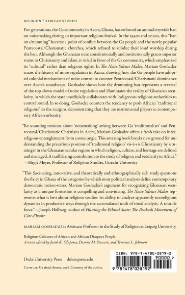 For generations, the Ga community in Accra, Ghana, has enforced an annual citywide ban on noisemaking during an important religious festival. In the 1990s and 2000s, this "ban on drumming" became a point of conflict between the Ga people and the newly popular Pentecostal/Charismatic churches, which refused to subdue their loud worship during the ban. Although the Ghanaian state constitutionally and institutionally grants superior status to Christianity and Islam, it ruled in favor of the Ga community, which emphasized its "cultural" rather than religious rights. In The Noise Silence Makes, Mariam Goshadze traces the history of noise regulation in Accra, showing how the Ga people have adopted colonial mechanisms of noise control to counter Pentecostal/Charismatic dominance over Accra's soundscape. Goshadze shows how the drumming ban represents a reversal of the top-down model of noise regulation and illuminates the reality of Ghanaian secularity, in which the state unofficially collaborates with indigenous religious authorities to control sound. In so doing, Goshadze counters the tendency to push African "traditional religions" to the margins, demonstrating that they are instrumental players in contemporary African urbanity.