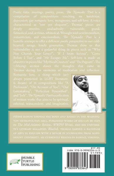 Poetic tales, musings, poetry, prose, The Nomadic Poet is a compilation of compositions touching on loneliness, depression, gay romantic love, metapoetry, and self-love. A voice characterized as "raw yet eloquent", Thomas' pieces are deeply emotive, unabashedly vulnerable, grand, fantastical, and, at times, whimsical. Wrought with sentimentalism, romanticism, and emotionalism, The Nomadic Poet is a humble attempt to offer a different poetic perspective to our cold-hearted, savage, lonely generation. Thomas show us that vulnerability is not a godawful thing in pieces such as "Why Not Cherish Your Lover?", "If I Seem Serious", "Come Before I Tear", and "He Escapes Me". Self-love is made an objective in pieces like "Mythical Creature" and "The Pageant". The Musings section shares the thoughts that came to Thomas during his moments of meditation and reflection. Romantic love, a thing which isn't always poeticized in LGBT literature, is dreamt of in compositions like "A Profession", "On Account of You", "Our Lovemaking", "Perfection Personified", and "In It". The Nomadic Poet is a collection of written works that aims to be spiritual, ethereal, transcendent, and imaginative.