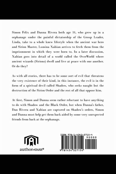 Simon Felix and Danna Rivera both age 14, who grew up in a orphanage under the painful dictatorship of the Group Leader, Linda, take to a whole knew lifestyle when the ancient war hero and Sirion Master, Lumina Xabian arrives to fetch them from the imprisonment in which they were born to. In a later discussion, Xabian goes into detail of a world called the OverWorld where ancient wizards (Sirions) dwell and live at peace with one another. Or do they? As with all stories, there has to be some sort of evil that threatens the very existence of their kind, in this instance, the evil is in the form of a spiritual devil called Shadow, who seeks naught but the destruction of the Sirion Order and the rest of all that oppose him. At first, Simon and Danna seem rather reluctant to have anything to do with Shadow and the Black Order, but when Danna's father, Dan Rivera and Xabian are captured on Shadow's orders, Simon and Danna must help get them back aided by some very unexpected friends from back at the orphanage.