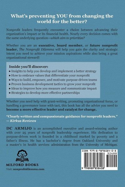The nonprofit leadership book that will help you become a more effective catalyst for change. What's preventing YOU from changing the world for the better? Two aims common to all nonprofits are advancing the organization's mission and advancing its financial health. In for-profit organizations, financial health is always the ultimate goal. But in nonprofit organizations, nearly every decision comes with the same underlying question-which aim to prioritize? The Nonprofit Dilemma will help you gain the clarity and strategic intent you need to become an exceptional leader. You can achieve your mission aspirations while also being a great organizational steward. Whether you are an executive, board member, or future nonprofit leader, use this book to become the leader you want to be. Inside you'll discover: ¿ Insights to help you develop and implement a better strategy ¿ How to embrace values that differentiate your nonprofit ¿ Ways to build, empower, and motivate purpose-driven teams ¿ Proven business development tactics to grow your nonprofit ¿ Ideas to improve how you measure and communicate impact ¿ Strategies to develop more effective partnerships ¿ And much more! Whether you need help with grant-writing, promoting organizational focus, or handling a governance issue with tact, this book has all the advice you need to become a more effective leader and catalyst for change. ¿¿Each year, a portion of the sales proceeds from this book are donated to notable nonprofits per the program described on the author's blog.¿¿