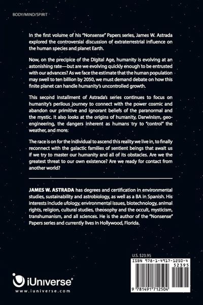 In the first volume of his "Nonsense" Papers series, James W. Astrada explored the controversial discussion of extraterrestrial influence on the human species and planet Earth. Now, on the precipice of the Digital Age, humanity is evolving at an astonishing rate-but are we evolving quickly enough to be entrusted with our advances? As we face the estimate that the human population may swell to ten billion by 2050, we must demand debate on how this finite planet can handle humanity's uncontrolled growth. This second installment of Astrada's series continues to focus on humanity's perilous journey to connect with the power cosmic and abandon our primitive and ignorant beliefs of the paranormal and the mystic. It also looks at the origins of humanity, Darwinism, geo-engineering, the dangers inherent as humans try to "control" the weather, and more. The race is on for the individual to ascend this reality we live in, to finally reconnect with the galactic families of sentient beings that await us if we try to master our humanity and all of its obstacles. Are we the greatest threat to our own existence? Are we ready for contact from another world?