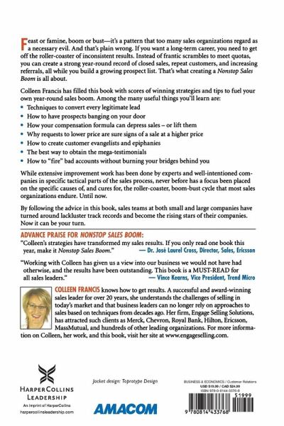 Nonstop Sales Boom explains how to break this unhealthy cycle and achieve strong, steady results--every quarter, from every member of the team. Has the last week of each quarter in your business become a mad scramble to meet quota? Do your year-end reports show sporadic and unexplainable highs some weeks that will be near impossible to meet next year, as well as mysterious lows that ruined your goals for a 10 percent increase? For many sales organizations, anomalies such as these are strangely commonplace and unshakeable without intentional efforts to ratify them. Author and experienced sales leader for over twenty years Colleen Francis says the secret to leaving behind the roller-coaster reports and achieving sustaining, steady success is to broaden the focus from merely closing deals to actively nurturing the four critical stages of client engagement: Attraction: Fill the funnel with lucrative prospects Participation: Turn them into customers faster Growth: Invest in valued clients Leverage: Turn customers into referral generators When companies concentrate on only one or two of these areas, their results become erratic. But by becoming purposeful toward all four, simultaneously, they will systematically attract a regular flow of prospects and move them smoothly through the pipeline--taking the chaos and pressure away from the end of quarter for good!