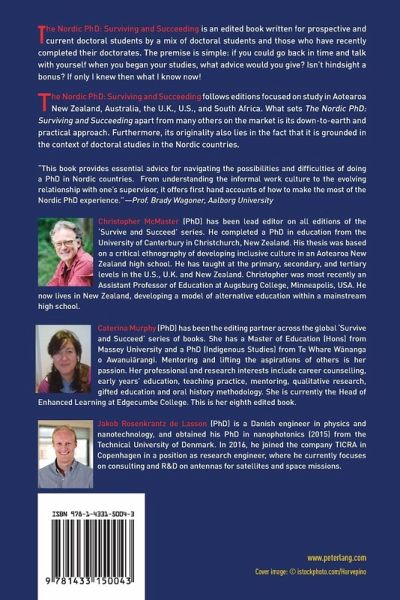 The Nordic PhD: Surviving and Succeeding follows editions focused on study in Aotearoa New Zealand, Australia, the U.K., U.S., and South Africa. What sets The Nordic PhD: Surviving and Succeeding apart from many others on the market is its down-to-earth and practical approach. Furthermore, its originality also lies in the fact that it is grounded in the context of doctoral studies in the Nordic countries.