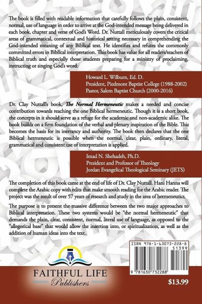 The purpose is to present the massive difference between the two major approaches to Biblical interpretation. These two systems would be "the normal hermeneutic" that demands the plain, clear, consistent, normal, literal use of language, as opposed to the "allegorical base" that would allow the insertion into, or spiritualization, as well as the addition of human ideas into the text.
