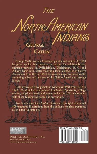 The North American Indians by George Catlin being letters and notes on their manners customs and conditions. Volume two of two, both Volumes contain 320 illustrations from the John Grant 1926 edition. George Catlin was an American painter and writer. In 1823 he gave up his law practice to pursue his self-taught art, painting portraits in Philadelphia, Washington, D. C. and Albany, New York. After meeting a tribal delegation of Native Americans from the Far West he became eager to preserve the vanishing tribes and customs of the Native Americans through his art. Catlin traveled throughout the American West from 1832 to 1840. He sketched and painted hundreds of portraits, village scenes, religious rituals and games and wrote of his encounters with these fascinating people as he worked. The North American Indians features fifty-eight letters and 320 illustrations from the author’s original portraits, all in a two-volume set. Volume 1 ISBN 978-1582182735 Volume 2 ISBN 978-1582182742