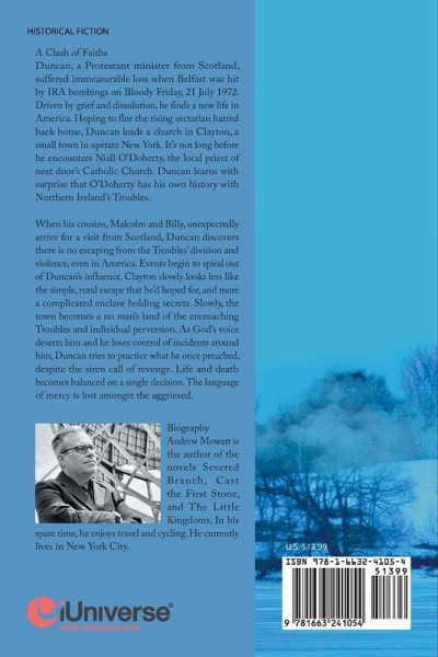 A Clash of Faiths Duncan, a Protestant minister from Scotland, suffered immeasurable loss when Belfast was hit by IRA bombings on Bloody Friday, 21 July 1972. Driven by grief and dissolution, he finds a new life in America. Hoping to flee the rising sectarian hatred back home, Duncan leads a church in Clayton, a small town in upstate New York. It's not long before he encounters Niall O'Doherty, the local priest of next door's Catholic Church. Duncan learns with surprise that O'Doherty has his own history with Northern Ireland's Troubles. When his cousins, Malcolm and Billy, unexpectedly arrive for a visit from Scotland, Duncan discovers there is no escaping from the Troubles' division and violence, even in America. Events begin to spiral out of Duncan's influence. Clayton slowly looks less like the simple, rural escape that he'd hoped for, and more a complicated enclave holding secrets. Slowly, the town becomes a no man's land of the encroaching Troubles and individual perversion. As God's voice deserts him and he loses control of incidents around him, Duncan tries to practice what he once preached, despite the siren call of revenge. Life and death becomes balanced on a single decision. The language of mercy is lost amongst the aggrieved.