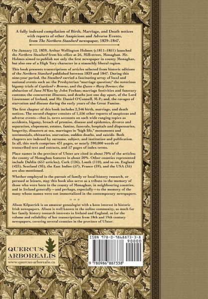A fully indexed compilation of Birth, Marriage, and Death notices, with reports of other Auspicious and Adverse Events, from The Northern Standard newspaper, 1839-1847. On January 12, 1839, Arthur Wellington Holmes (c.1811-1851) launched The Northern Standard from his office at 26, Mill-street, Monaghan. Mr. Holmes aimed to publish not only the first newspaper in the county of Monaghan, but also one of a High Tory character in a staunchly liberal region. This book presents transcriptions of articles selected from historic editions of The Northern Standard published between January, 1839 and December, 1847. During this nine-year period, the Standard carried a fascinating array of local and national events such as: the Presbyterian "marriage question;" the notorious bigamy trials of Copeland v Browne, and the Queen v Mary Downes; the abduction of Jane M'Kee by John Feehan; marriage festivities, and funerary customs; the concurrent illnesses, and deaths just one day apart, of the Earl of Besborough, Lord Lieutenant of Ireland, in Dublin, and of Mr. Daniel O'Connell, M.P., at Genoa in Italy; and, the ravages of starvation and disease during the early years of the Great Famine. The first chapter of this book includes 2,346 birth, marriage, and death notices. The second chapter consists of 1,556 reports of other auspicious and adverse events-that is, news accounts on such wide-ranging subjects as accidents, bigamy, breach of promise, disease and epidemics, divorce and separation, elopement, estates, famine, funerals, hospitals and dispensaries, longevity, disasters at sea, marriages in high life, monuments and testimonials, obituaries, starvation, sudden deaths, and suicide. Both chapters are indexed by surname, subject, and institution and publication. In all, this work comprises 431 pages, or nearly 390,000 words, of transcribed text and extracts, and 57 pages of index terms. Place names in the province of Ulster are cited in about 70% of the articles in this volume; the county of Monaghan features in about 20%. Other counties are represented, including Dublin (651 articles), Cork (126), Louth (110), and so on. England (423), Scotland (93), the East Indies (57), France (39), and the USA (35), are also mentioned. Whether employed in the pursuit of family or local history research, or perused at leisure, may this book also serve as a tribute to the memory of the people who were born in the county Monaghan, in neighbouring counties, and in Ireland generally-and perhaps, especially-to the memory of the many Irish whose names were not immortalized in The Northern Standard or other contemporary newspapers. Alison Kilpatrick is an amateur genealogist with a keen interest in historic newspapers. Alison is well known in the online community, as much for her family history research interests in Ireland and England, as for the volume and reliability of her transcriptions from 18th and 19th century Irish newspapers, covering several counties in the province of Ulster.